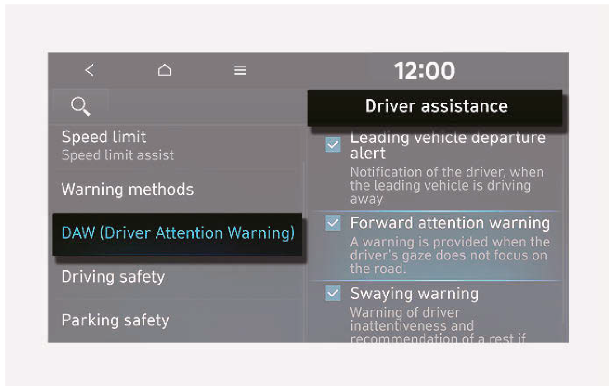 在車輛運轉時,從資訊娛樂系統選擇或取消Settings (設定) > Vehicle (車輛) > Driver assistance (駕駛人輔助) > DAW (Driver Attention Warning) (DAW (駕駛人注意力警告)) > Forward attention warning (前方注意力警告),以設定是否使用此功能。