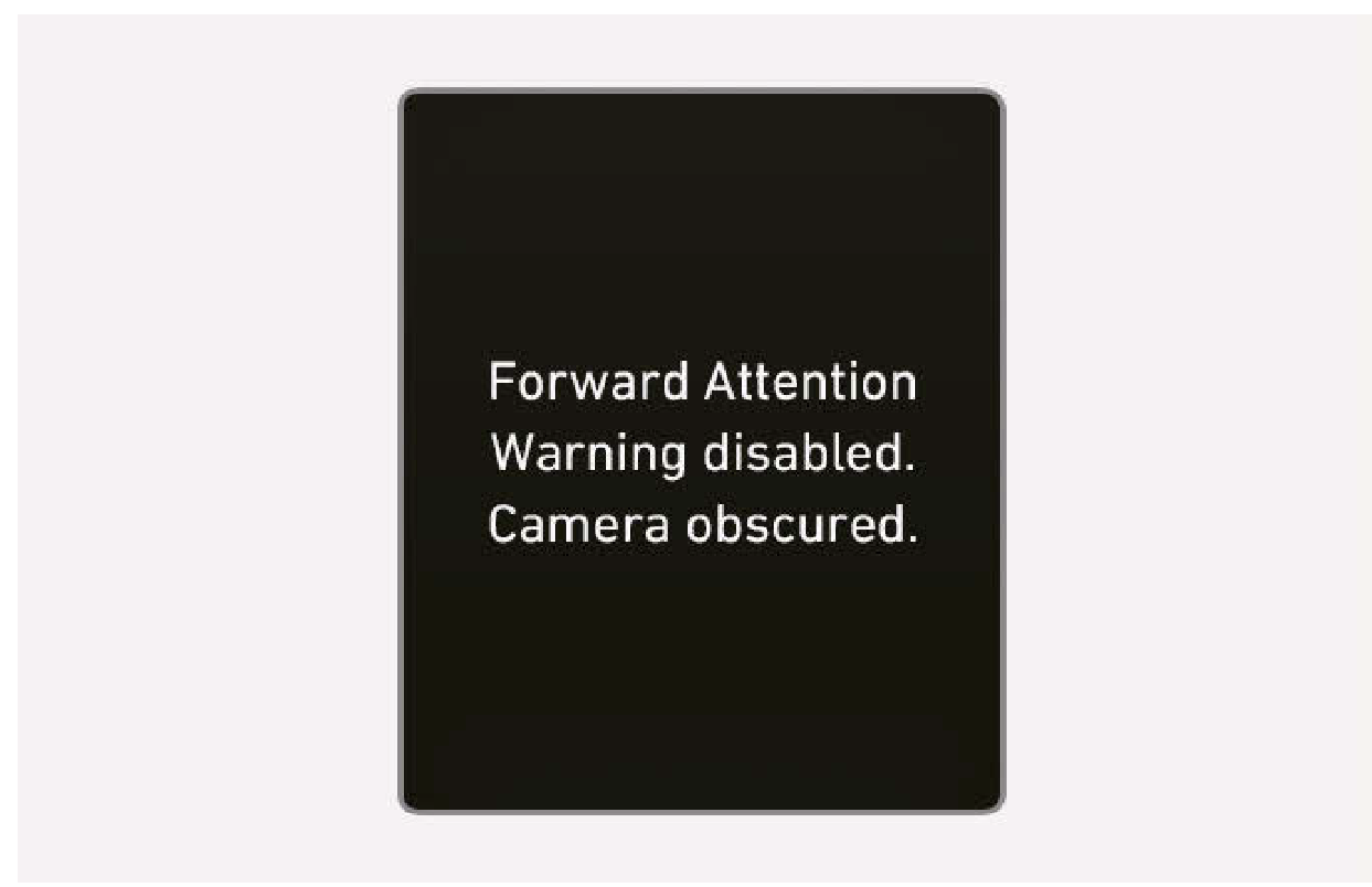 車內攝影機正前方或駕駛人和攝影機之間有物體達一段時間時,前方注意力警告將無法正常操作,且 “Forward Attention Warning disabled. Camera obscured” 警告訊息會在儀錶組顯示,並發出警告聲。