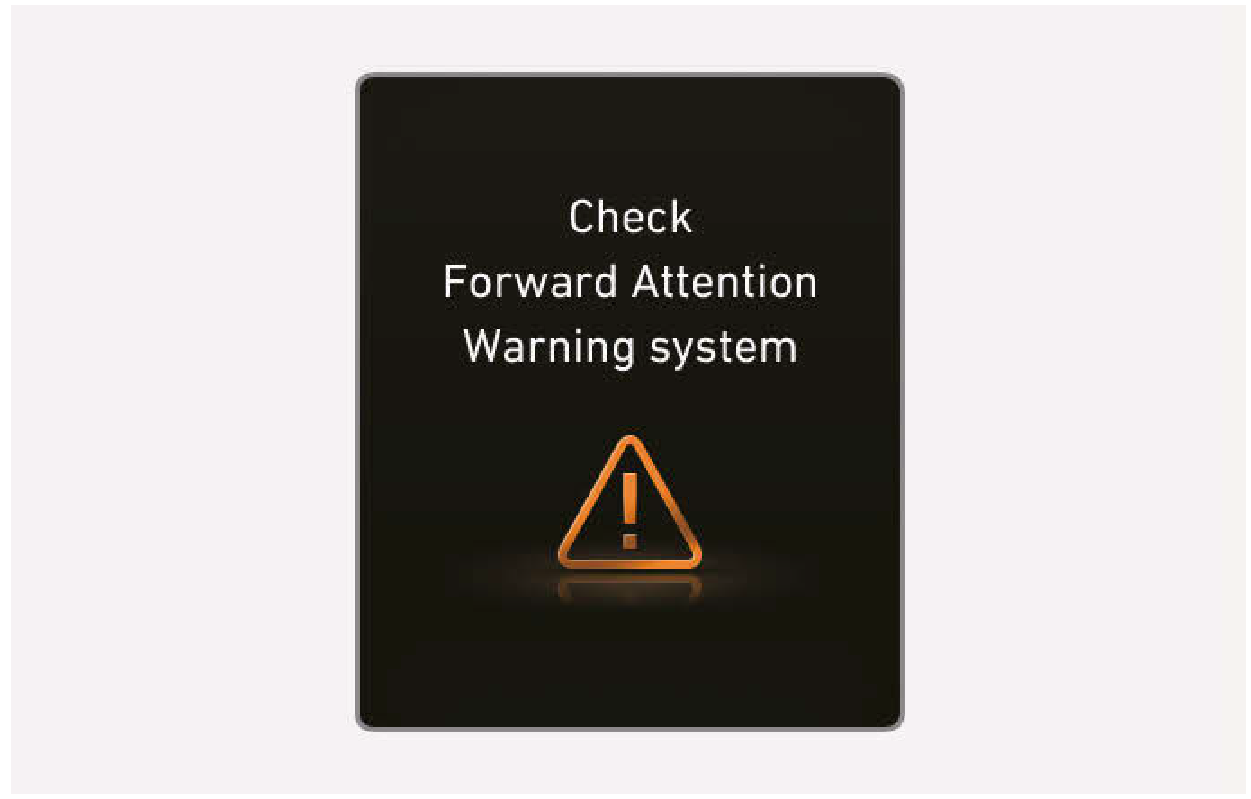 車內攝影機正前方或駕駛人和攝影機之間有物體達一段時間時,前方注意力警告將無法正常操作。如果發生此狀況,“Check Forward Attention Warning system” 警告訊息會在儀錶組顯示幾秒鐘,且()警告燈會在儀錶組亮起,並發出警告聲,直到前方注意力警告正常操作為止。
