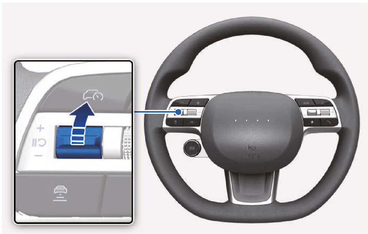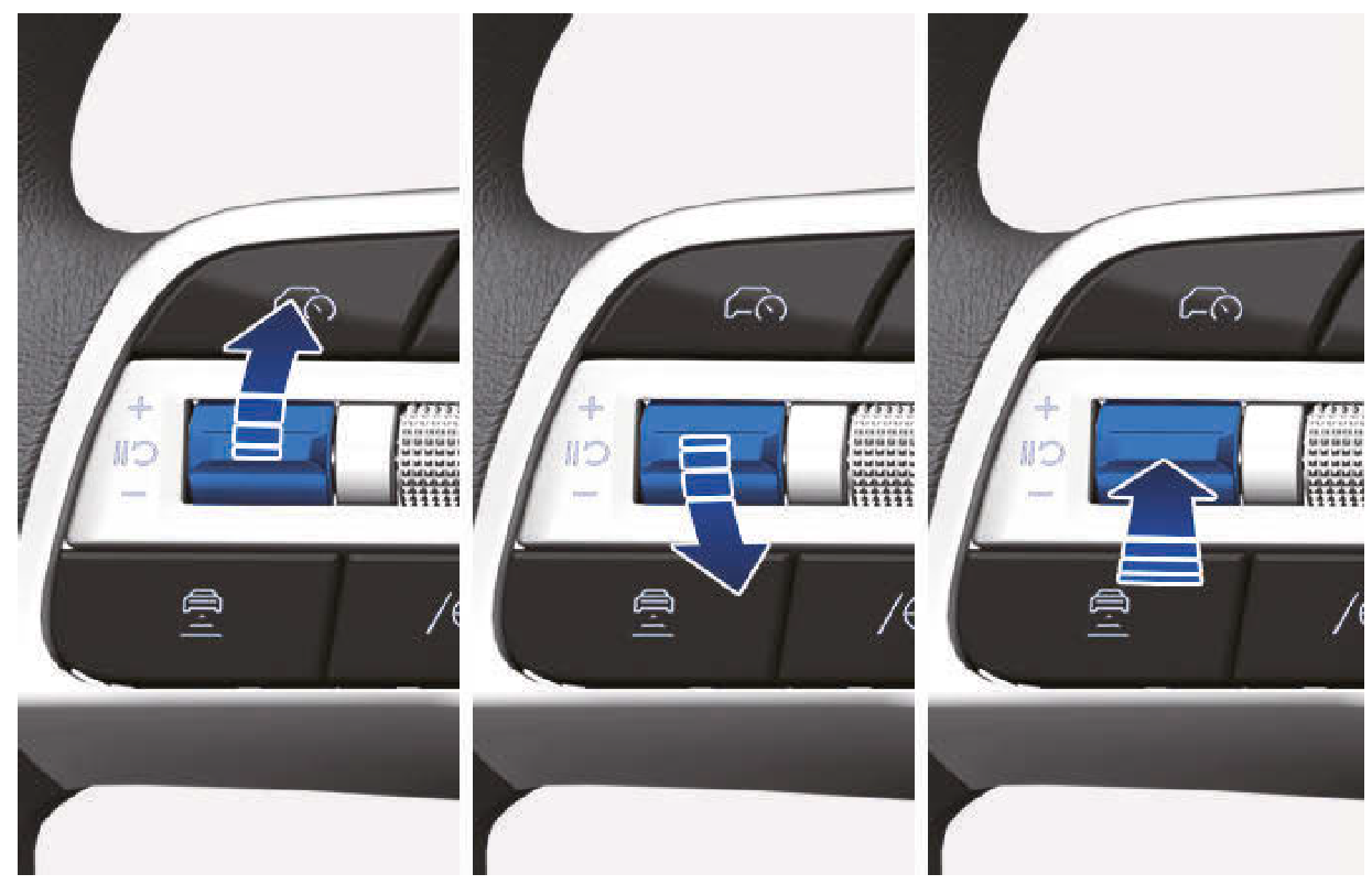 - 將+開關向上推並立即釋放。每次以此方式操作開關時,定速速度會以1 km/h的速度增加。