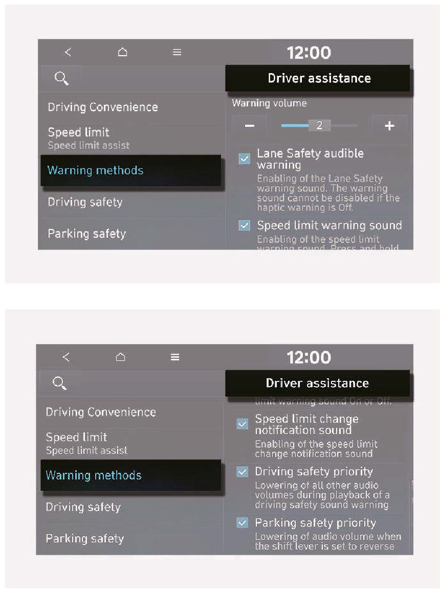 - 車輛重新啟動後,警告方式會維持在上次的設定。