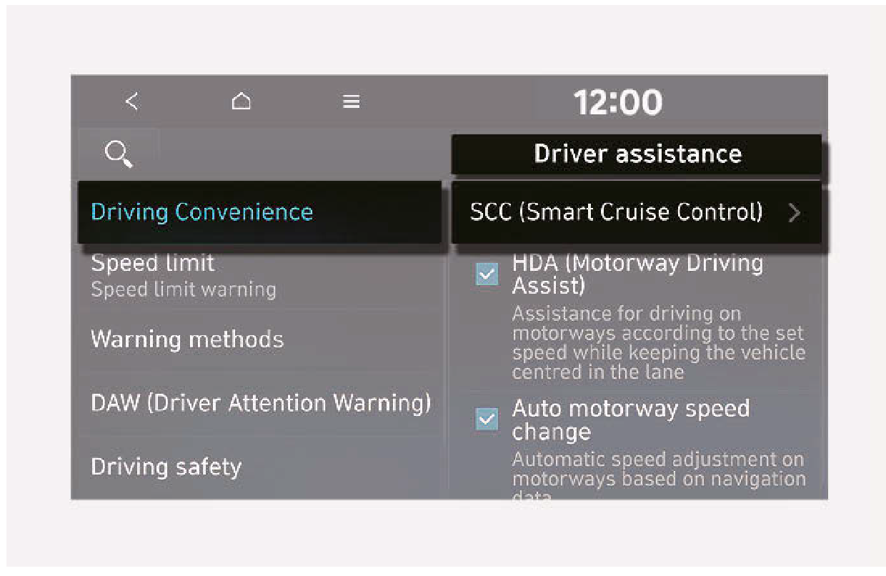 車輛運轉時,在儀錶組選擇User Settings (使用者設定) > Driver Assistance (駕駛人輔助) > Smart Cruise Control (智慧定速控制),或在資訊娛樂系統選擇Settings (設定) > Vehicle (車輛) > Driver assistance (駕駛人輔助) > Driving convenience (駕駛便利) > SCC (Smart Cruise Control) (SCC (智慧定速控制)), 您可手動變更車距、加速和反應速度。