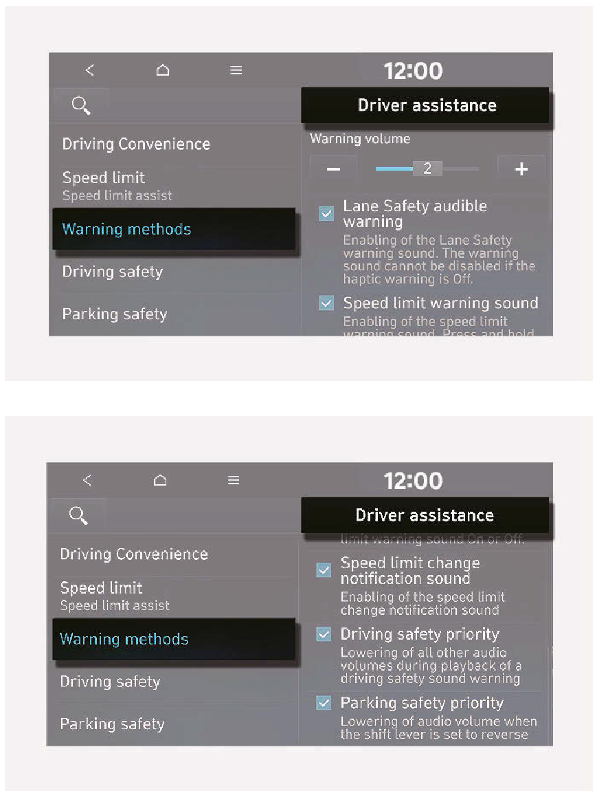 - 如果您變更警告方式,則其他駕駛人輔助系統的警告方式可能也會變更。