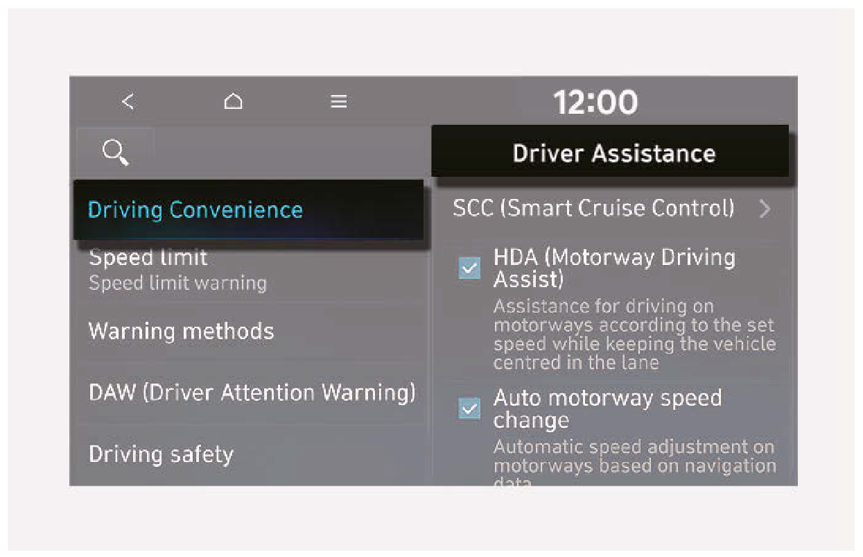 車輛運轉時,在資訊娛樂系統選擇Settings (設定) > Vehicle (車輛) > Driver assistance (駕駛人輔助) > Driving convenience (駕駛便利) > HDA (Motorway Driving Assist (HDA (快速道路駕駛輔助),以設定是否使用每一功能。