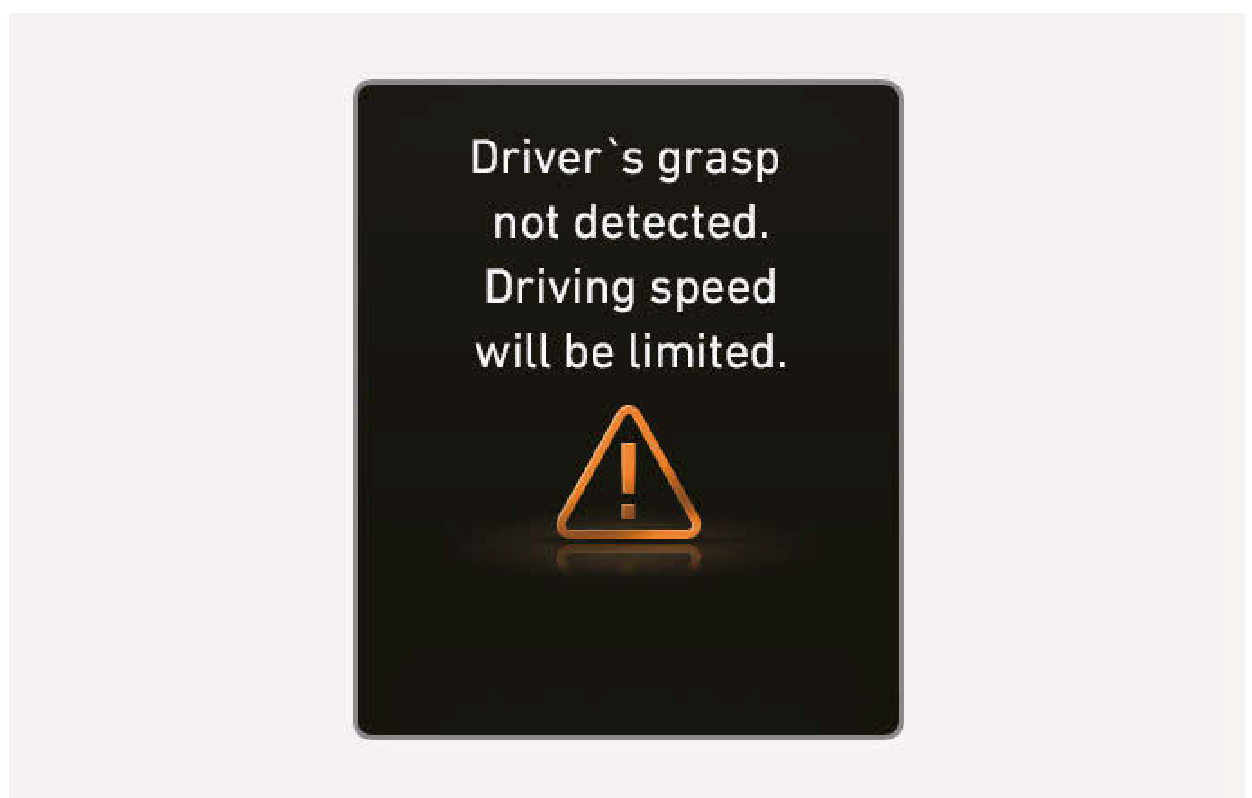 駕駛速度限制功能操作時,“Driver's grasp not detected. Driving speed will be limited” 警告訊息將會在儀錶組顯示, 且聲音警告會持續響起。