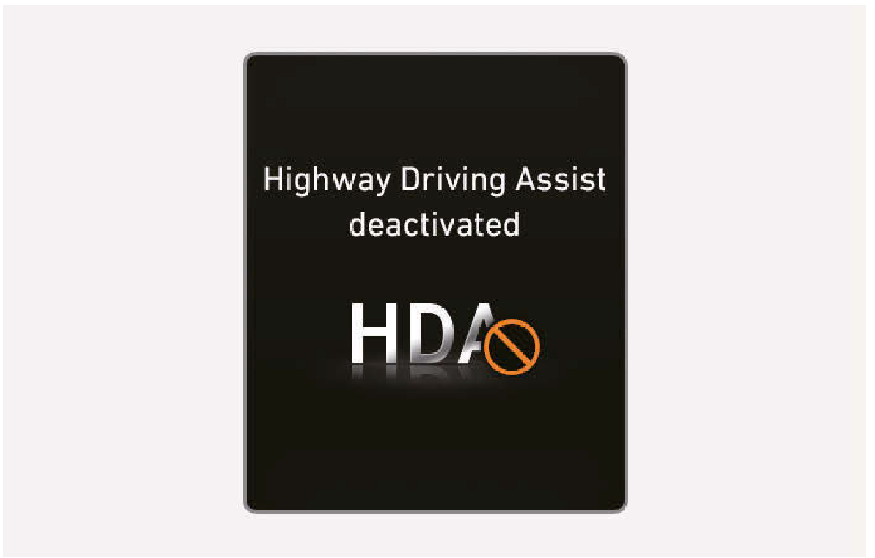 如果放手警告之後,駕駛人仍然未將手放在方向盤上,“Highway Driving Assist deactivated” 警告訊息將會顯示,且高速公路駕駛輔助將會自動取消。