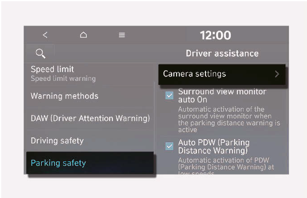 - Parking safety priority (駐車安全優先):周邊視野監視器操作時,您的車輛會降低其他所有的音量。