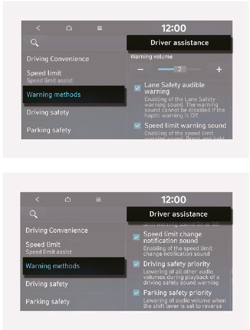 - 如果您變更警告方式,則其他駕駛人輔助系統的警告方式可能也會變更。