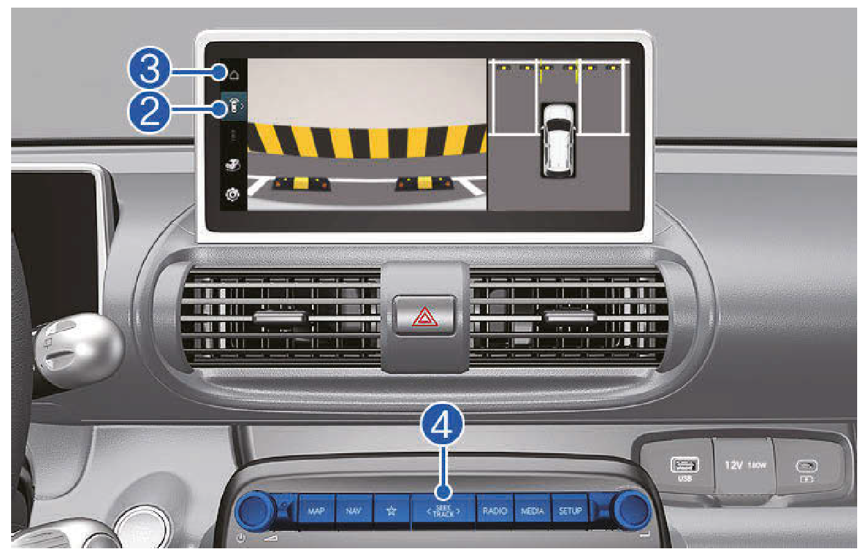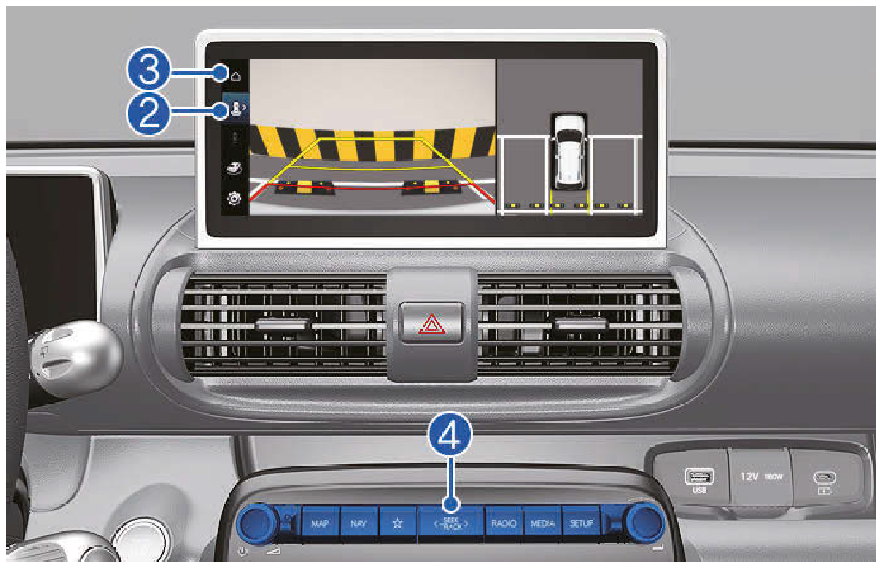 - 按下駐車/查看按鈕(1)或資訊娛樂系統按鈕(4)。