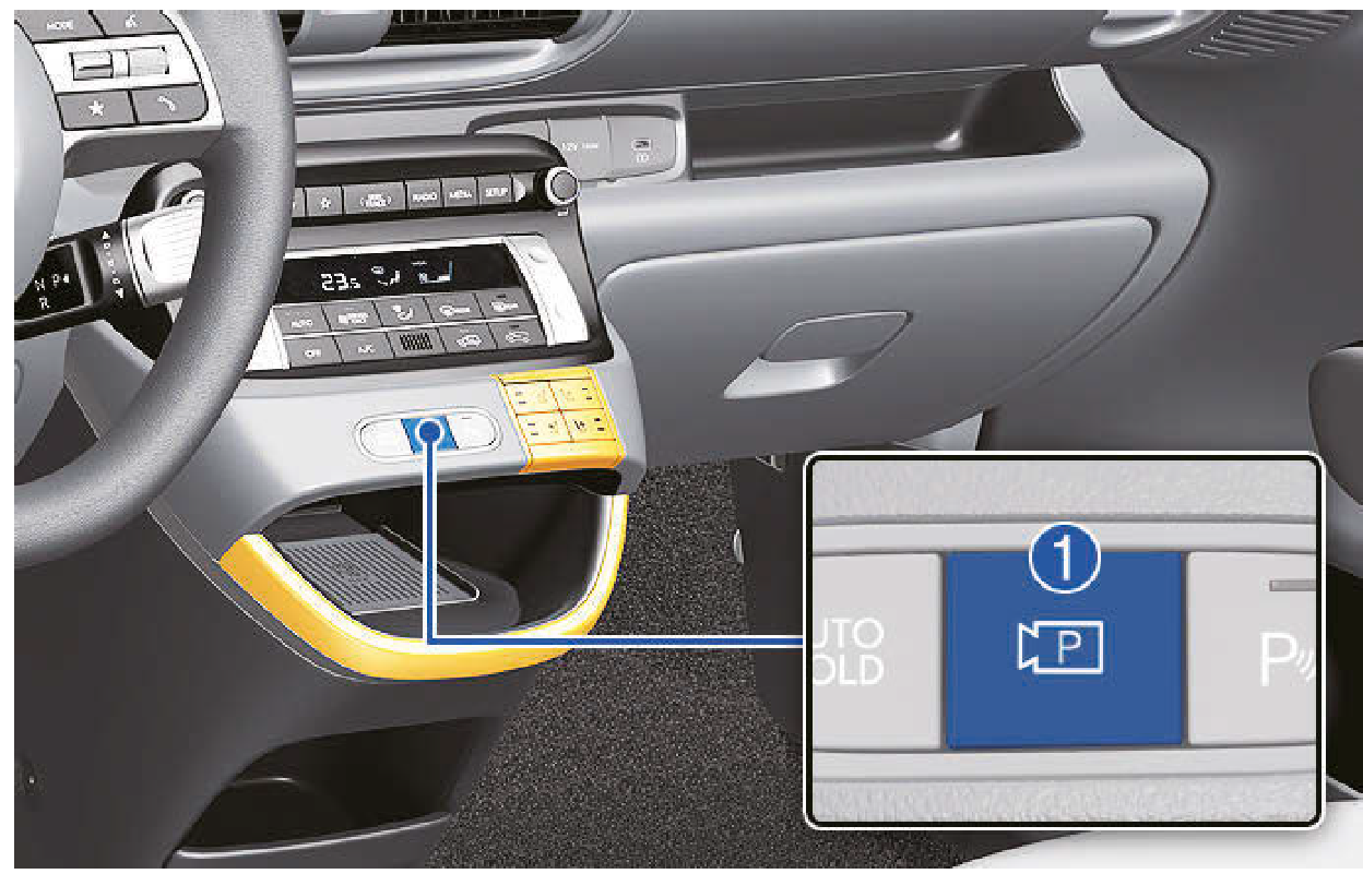 - 車速高於10 km/h且檔位切換到N (空檔)或D (前進)時,按下駐車/查看按鈕(1)可啟用周邊視野監視器。