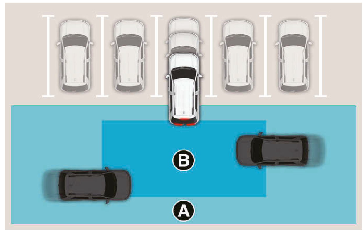 後方交會碰撞避免輔助可在您的車輛倒車時,偵測從左後或右後方接近的車輛,並利用警告訊息和警告聲,警告您可能發生撞擊。此外,後方交會碰撞避免輔助可以幫助您的車輛煞車,以避免撞擊。