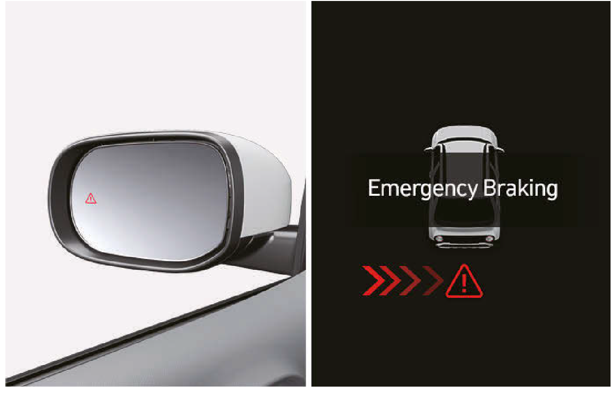 - 欲警告駕駛人有車輛從您車輛的左/右後側接近時,車外後視鏡上的警告燈將會閃爍,且警告訊息會在儀錶組顯示。同時,警告聲將會響起。警告也會在資訊娛樂系統螢幕顯示。