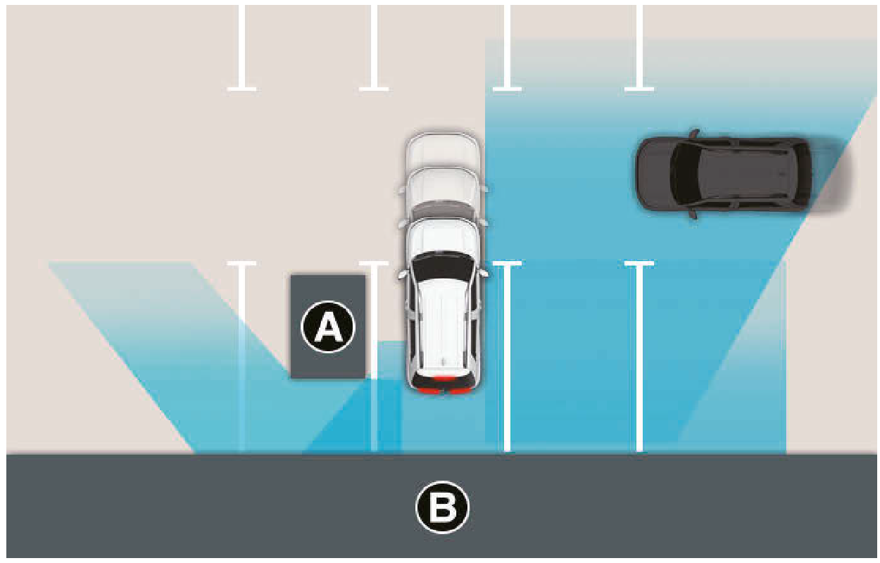 - 如果感知器被阻擋或故障時車輛熄火並重新啟動,此狀況會維持。因此,後方交會碰撞避免輔助可能無法正常操作。