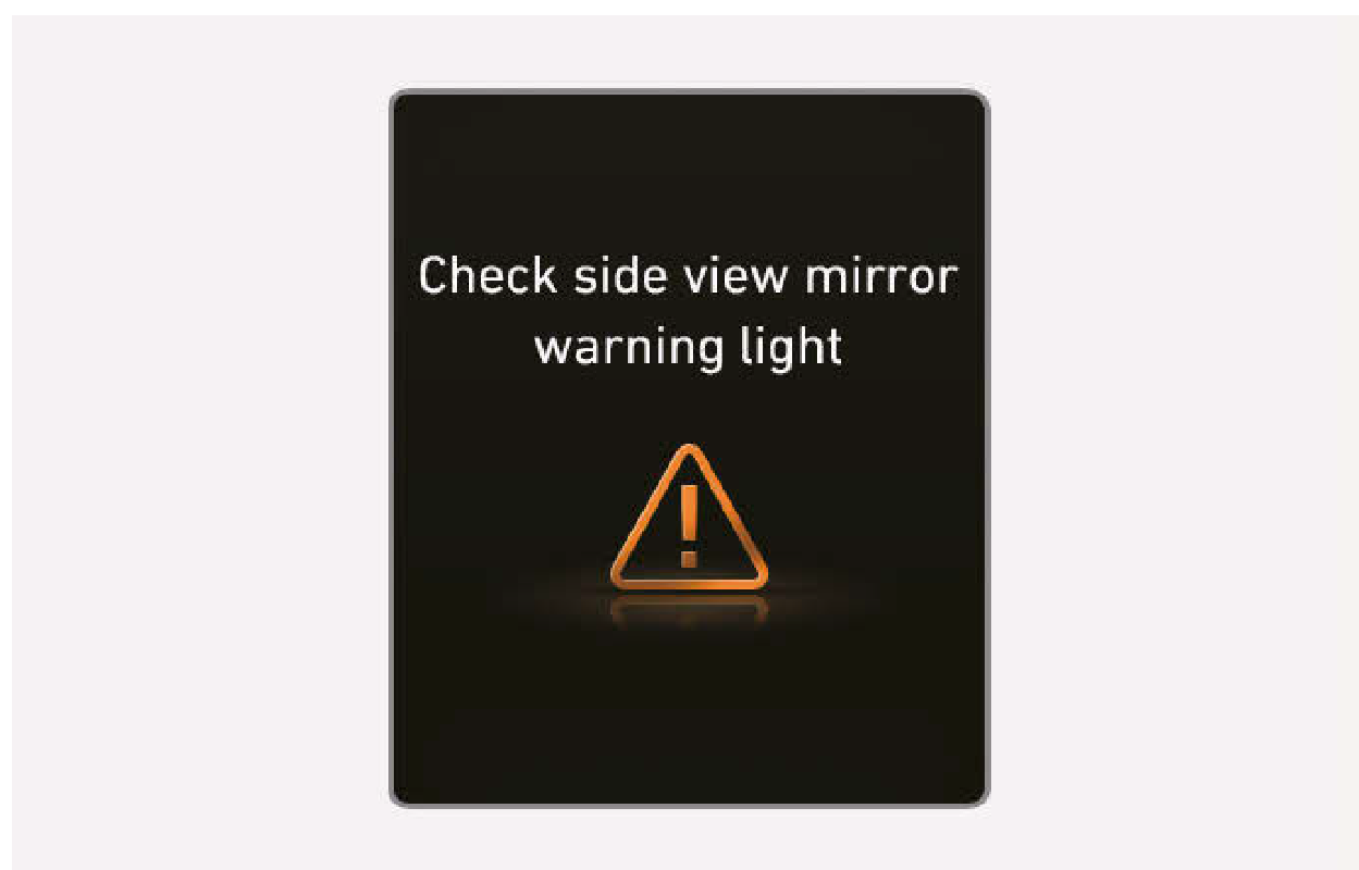 車外後視鏡警告燈操作不正常時,“Check side view mirror warning light” 警告訊息會在儀錶組顯示幾秒鐘,且主()警告燈會在儀錶組亮起。如果發生此狀況,我們建議您將車輛交由三陽汽車經銷商檢查。
