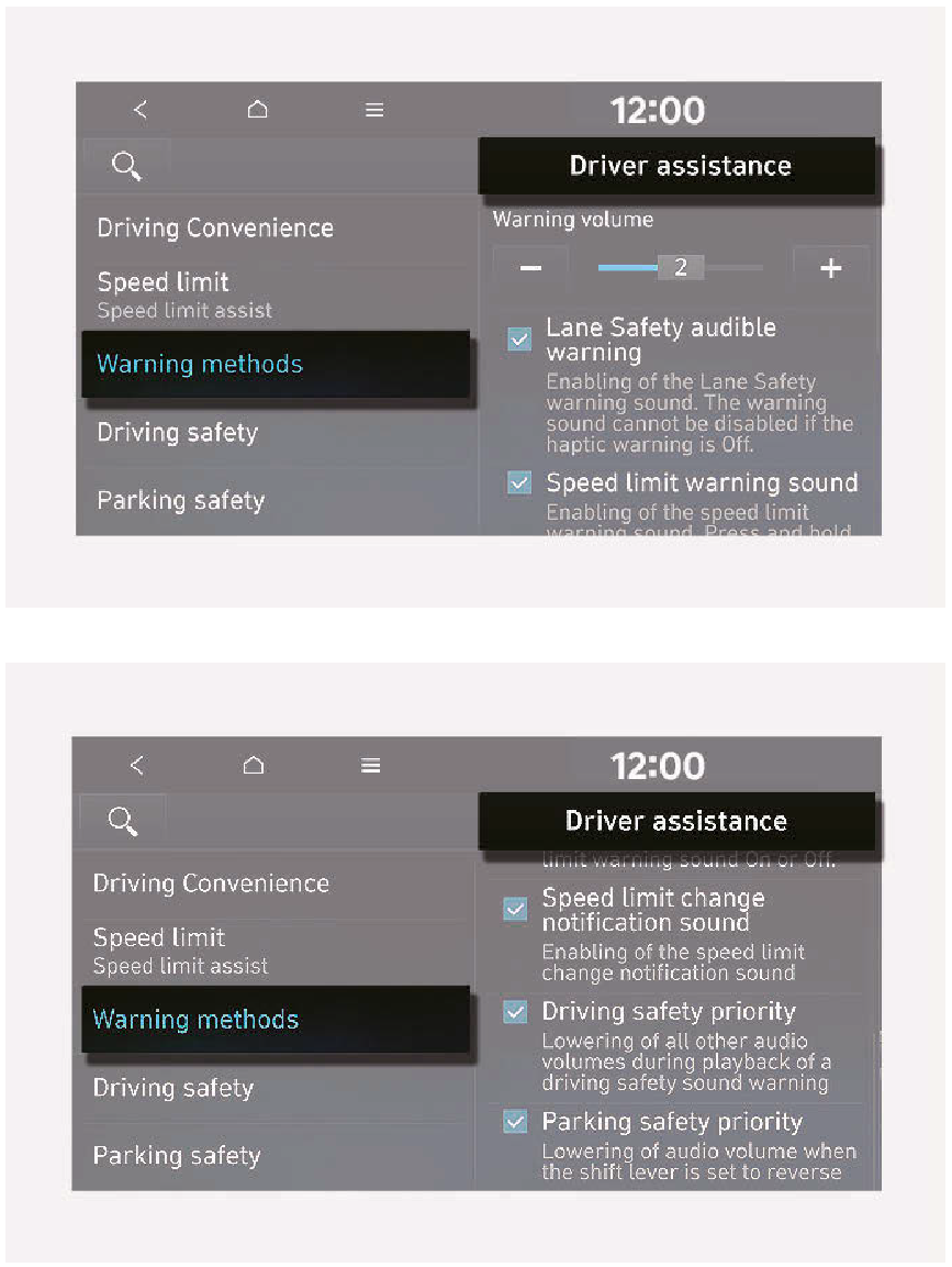 - 即使車輛重新啟動,警告方式仍會維持在上次的設定。