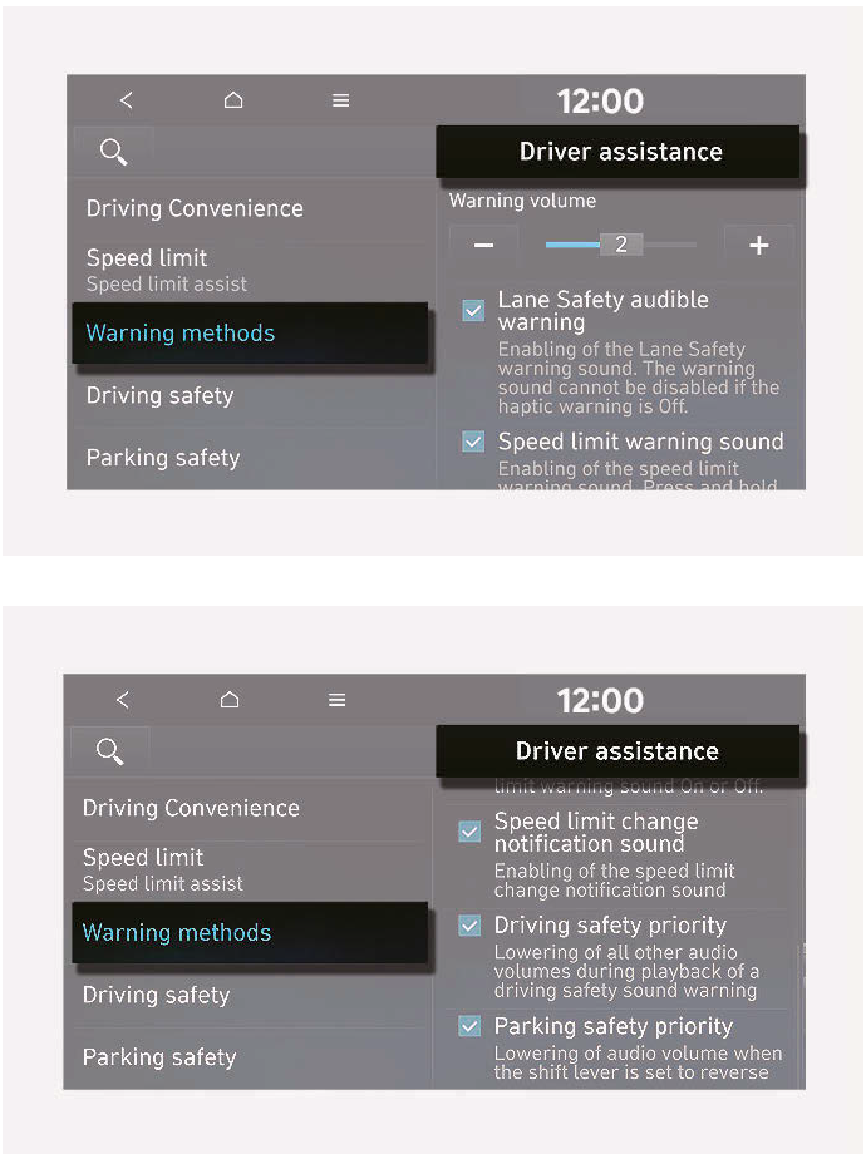 - 即使車輛重新啟動,警告方式仍會維持在上次的設定。