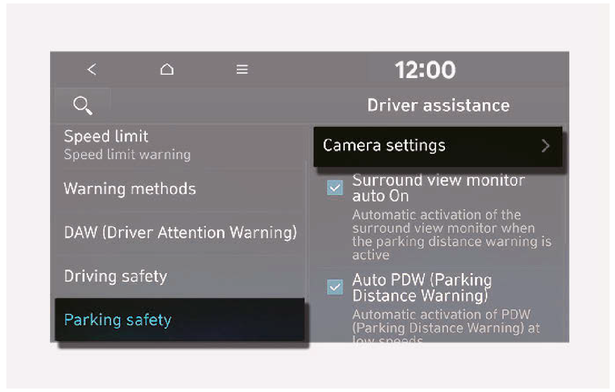 車輛運轉時,在儀錶組選擇User Settings (使用者設定) > Driver Assistance (駕駛人輔助) > Parking Safety (駐車安全) > Parking Distance Warning Auto On (駐車距離警告自動啟用),或在資訊娛樂系統選擇Settings (設定) > Vehicle (車輛) > Driver assistance (駕駛人輔助) > Parking safety (駐車安全) > Auto PDW (Parking Distance Warning) (自動PDW (駐車距離警告))。