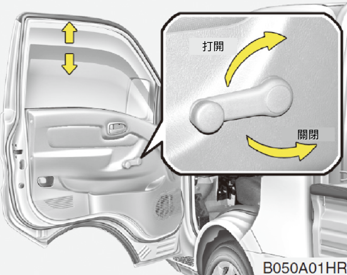 欲升起或降下車窗時,將車窗升降機把手順時針或逆時針轉動。
