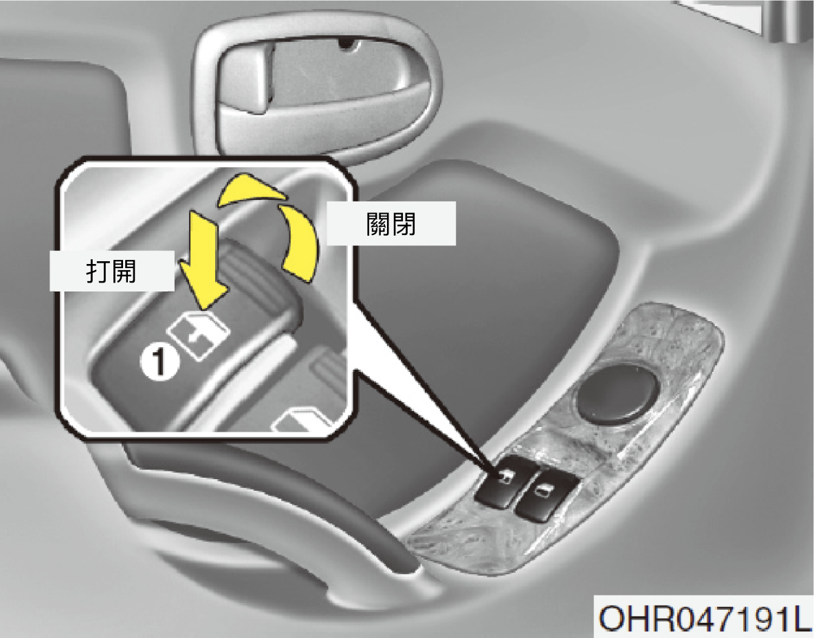 打開或關閉車窗時,確認所有乘客的手臂、手和身體經安全移開。