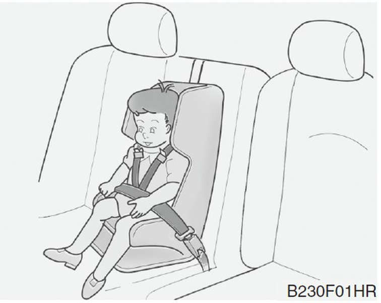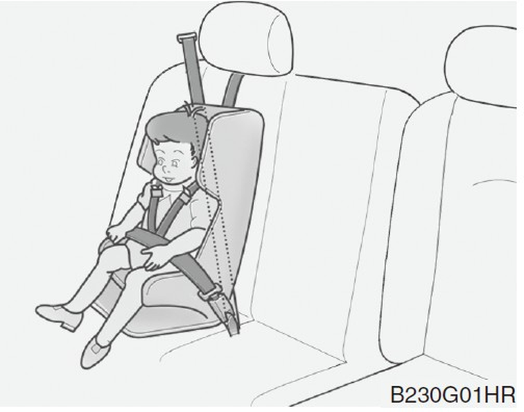 腰部/肩部安全帶或中央座椅的腰帶必須儘量放置在兒童的臀部並盡可能貼合身體。 - 如果安全帶不適合您的兒童,HYUNDAI建議在後座使用經過認可的輔助座椅,以提高兒童的乘坐高度,使安全帶適合您的兒童。