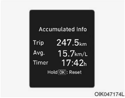 欲手動重設資訊時,可在查看累積駕駛資訊時按住 OK 按鈕。旅程距離、平均燃油經濟性以及總駕駛時間將會同時歸零。