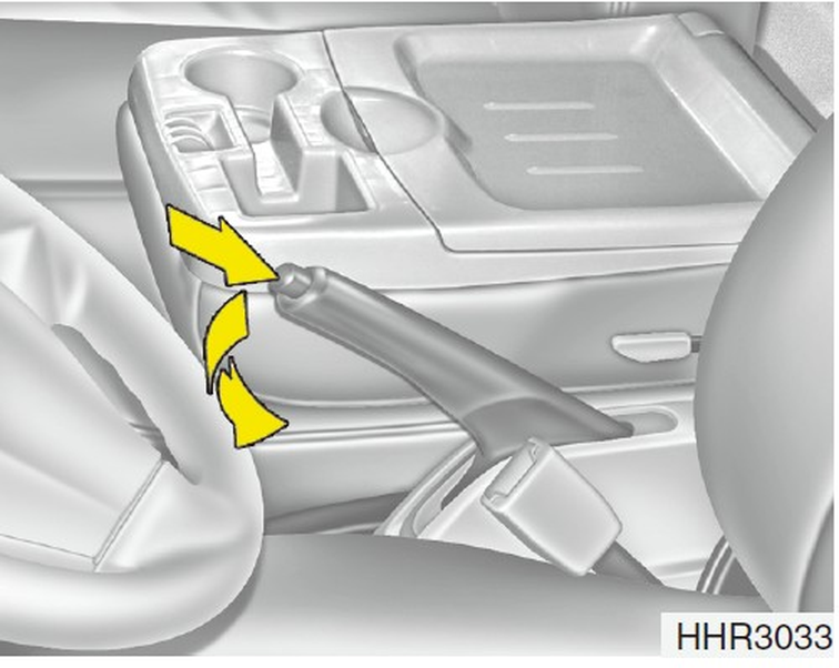 欲釋放駐車煞車時,先踩下腳煞車,並稍微將駐車煞車拉桿拉起。接著,按下釋放鈕,並在按住按鈕時,將駐車煞車拉桿降下。