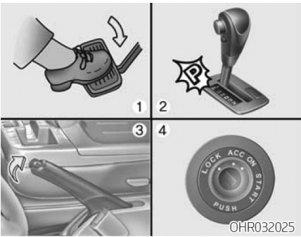 - 離開車子時一定要關掉發動的引擎,拔掉車鑰匙。如果讓引擎繼續發動,萬一排檔桿調整到「P」(駐車)以外的檔速時,車子可能因為蠕行(Creep)現象自己移動或是乘車時踩到油門踏板而讓車子突然移動。
