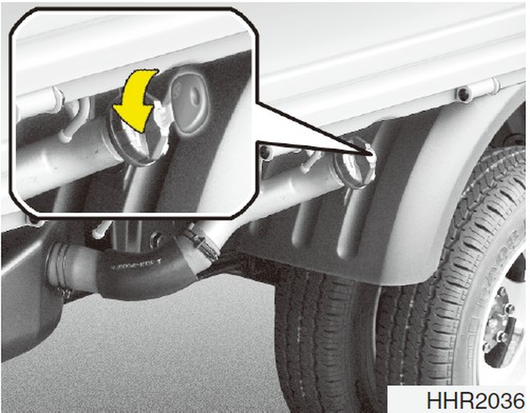- 燃油蒸汽具有危險。加油前,必須將引擎熄火且不可讓火花或開放火燄靠近油箱區域。如果您需要更換油箱蓋,請使用HYUNDAI原廠零件。