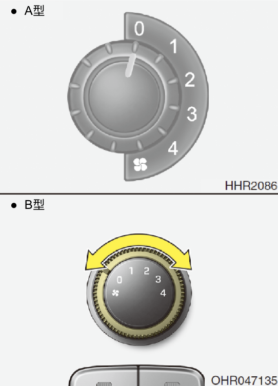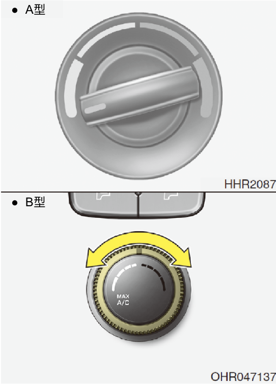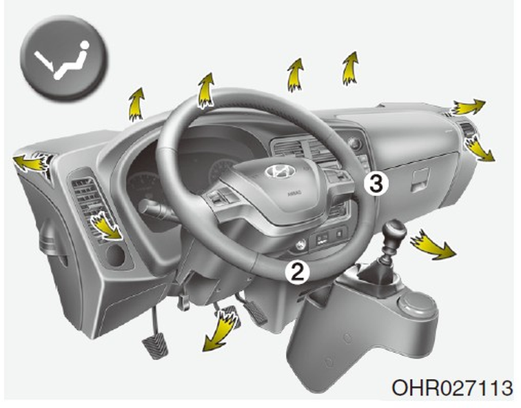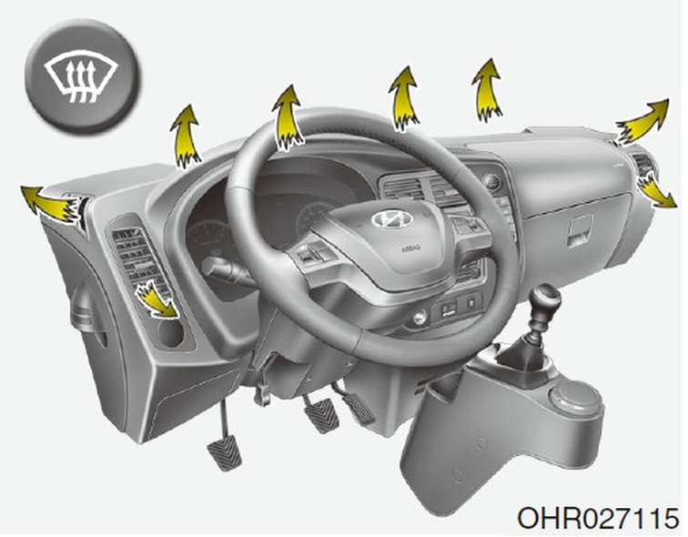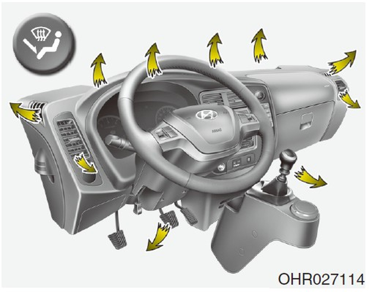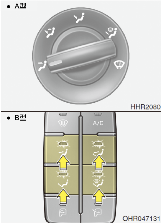 您的HYUNDAI配備有雙向出風暖氣控制。如此可以使來自儀錶板較冷的空氣和來自地板較暖的空氣同時出風。欲使用此功能時: