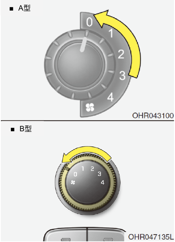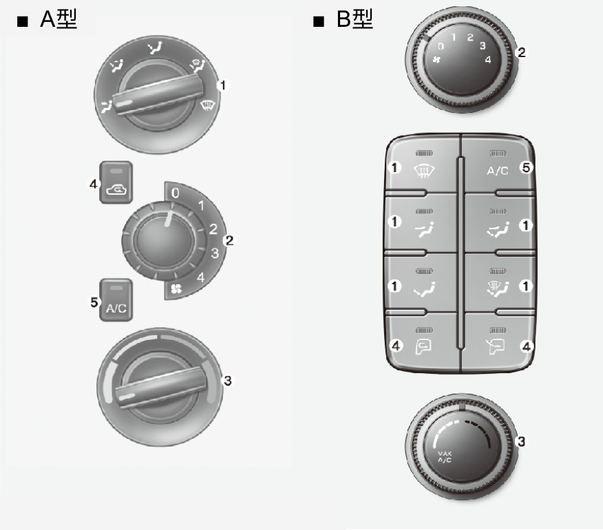 - 為了避免擋風玻璃內部起霧,可將進氣控制設定在新鮮空氣()位置,並將風速設定在需要的位置,開啟冷氣系統,並將溫度控制調整到需要的溫度。