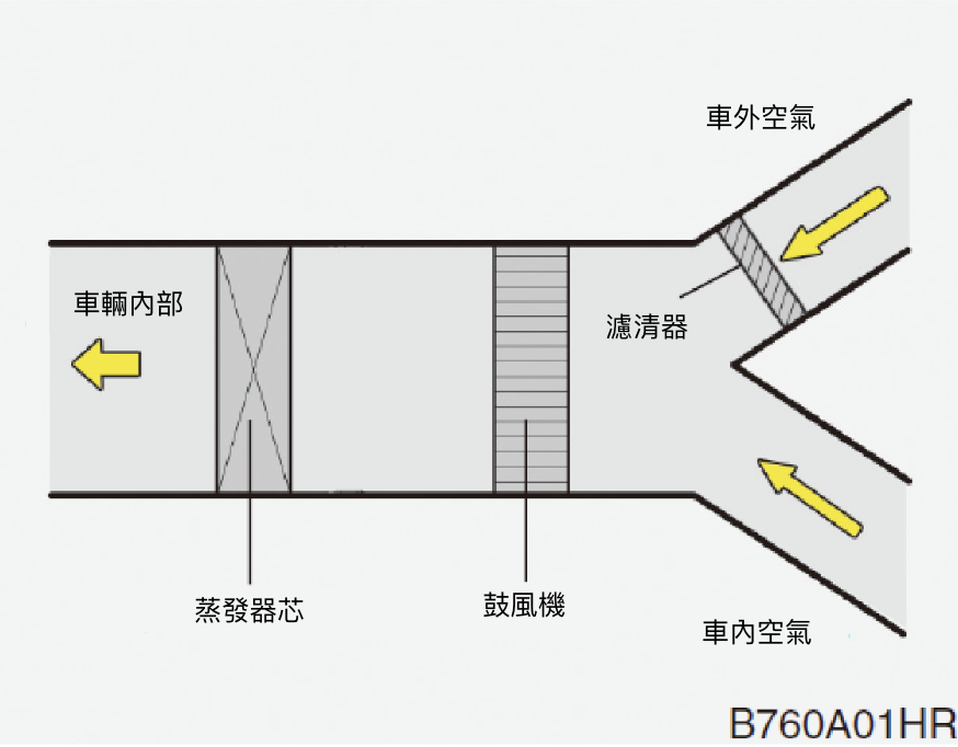 選擇車內循環空氣位置時,來自乘客室的空氣將會經由暖氣系統吸入,並依據選擇的功能進行加熱或冷卻。