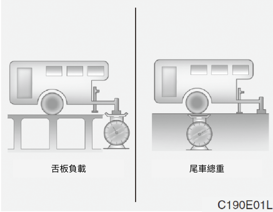 - 前軸或後軸重量不可超過車輛標示牌上所示的車軸總重(GAWR)。有可能您的拖曳裝備未超過GVWR,但超過GAWR。不正確的尾車裝載和/或尾車太多的物品裝載會使後軸超載。必須重新分配負載並再次檢查軸重。