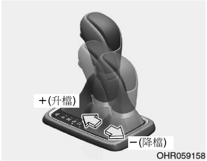 - 駕駛人將排檔桿切換到+(升檔)或-(降檔)位置時,如果下一個檔位超出許可的引擎轉速範圍,變速箱可能不會換檔。駕駛人必須依據道路狀況,執行升檔,小心將引擎轉速維持在紅線區以下。