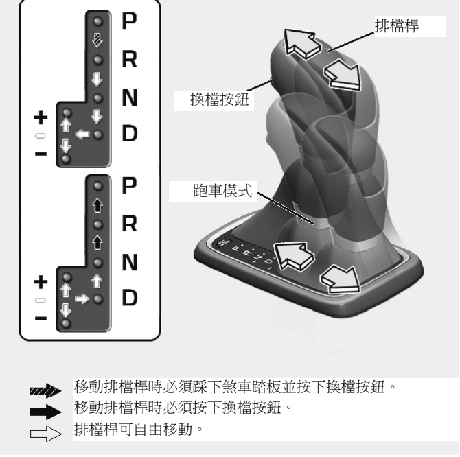 為了您的安全,本自排變速箱配備有排檔鎖系統,除非踩下煞車踏板,否則變速箱無法從P(駐車)排入R(倒檔)。