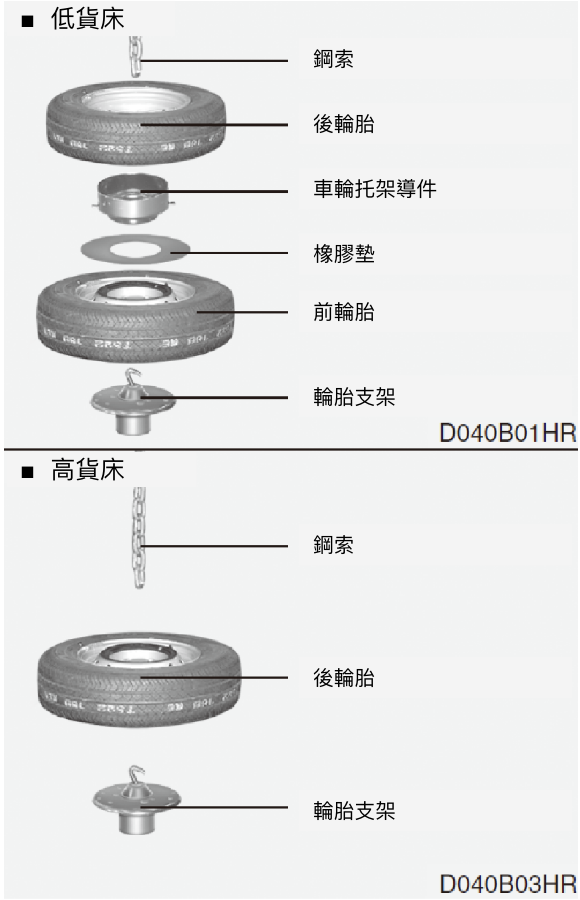 安裝備胎之後,必須立即檢查充氣壓力,並調整到規格。備胎存放時,胎壓必須定期檢查並維持在規定的壓力。