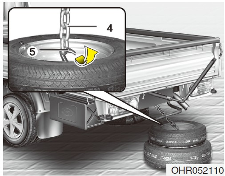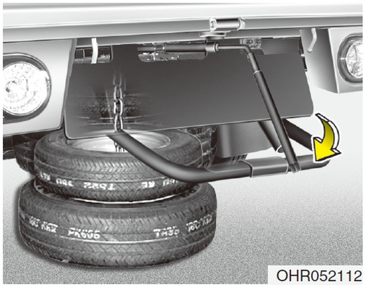 - 將備胎托架扳手插入備胎托架的孔中,逆時針轉動,然後降下備胎。