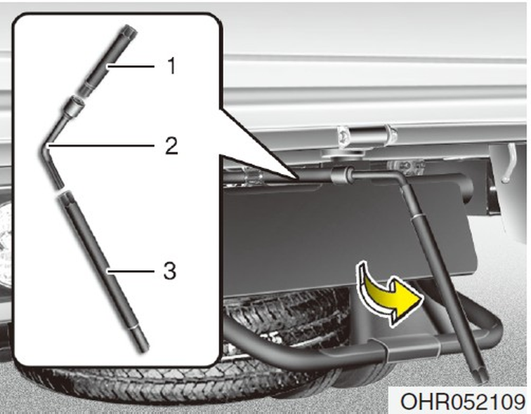 如圖中所示順序,將工具(1)(2)(3)組裝到備胎托架扳手。