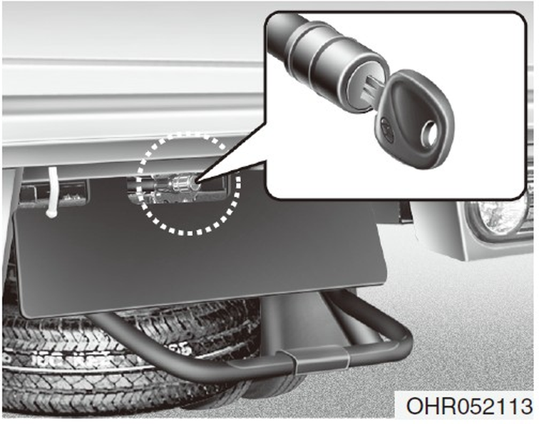 欲將備胎防盜裝置上鎖時,將和鑰匙連在一起的防盜鎖插入備胎托架的孔,壓下,直到聽到 "卡嗒" 聲,然後拉出鑰匙。
