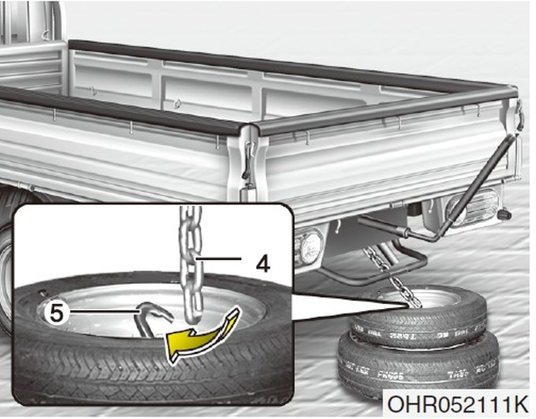 備胎完全降下之後,從支撐固定鉤(5)拆開鋼索(4)。