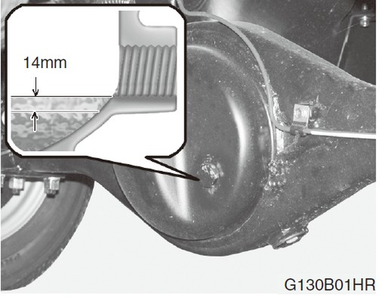- 使用合適的工具感覺孔內。齒輪油液位必須距離下緣14 mm以內。如果不是,在加油之前先檢查是否洩漏。欲添加或補充後軸齒輪油時,慢慢加入, 直到齒輪油到達適當的液位。不可過度添加。