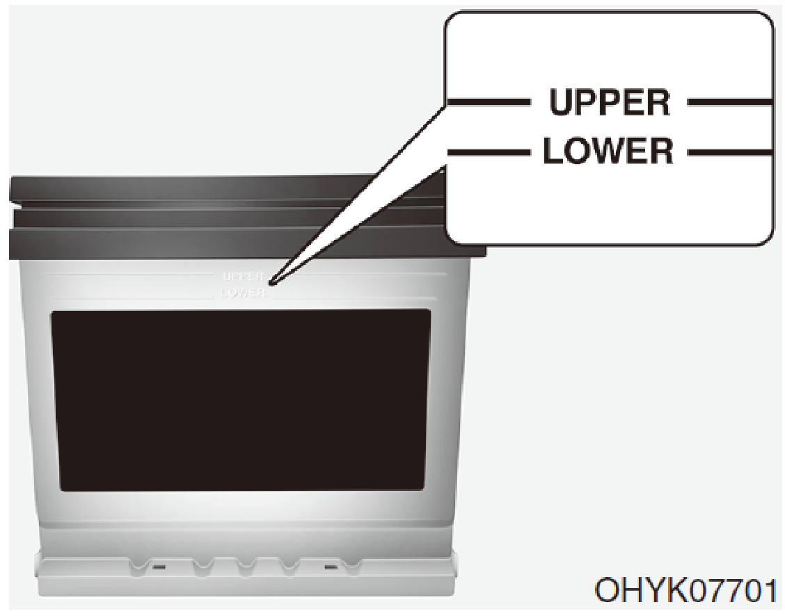 如果您的車輛配備側邊標示有LOWER (MIN)和UPPER (MAX)記號的電瓶,必須檢查電瓶液。