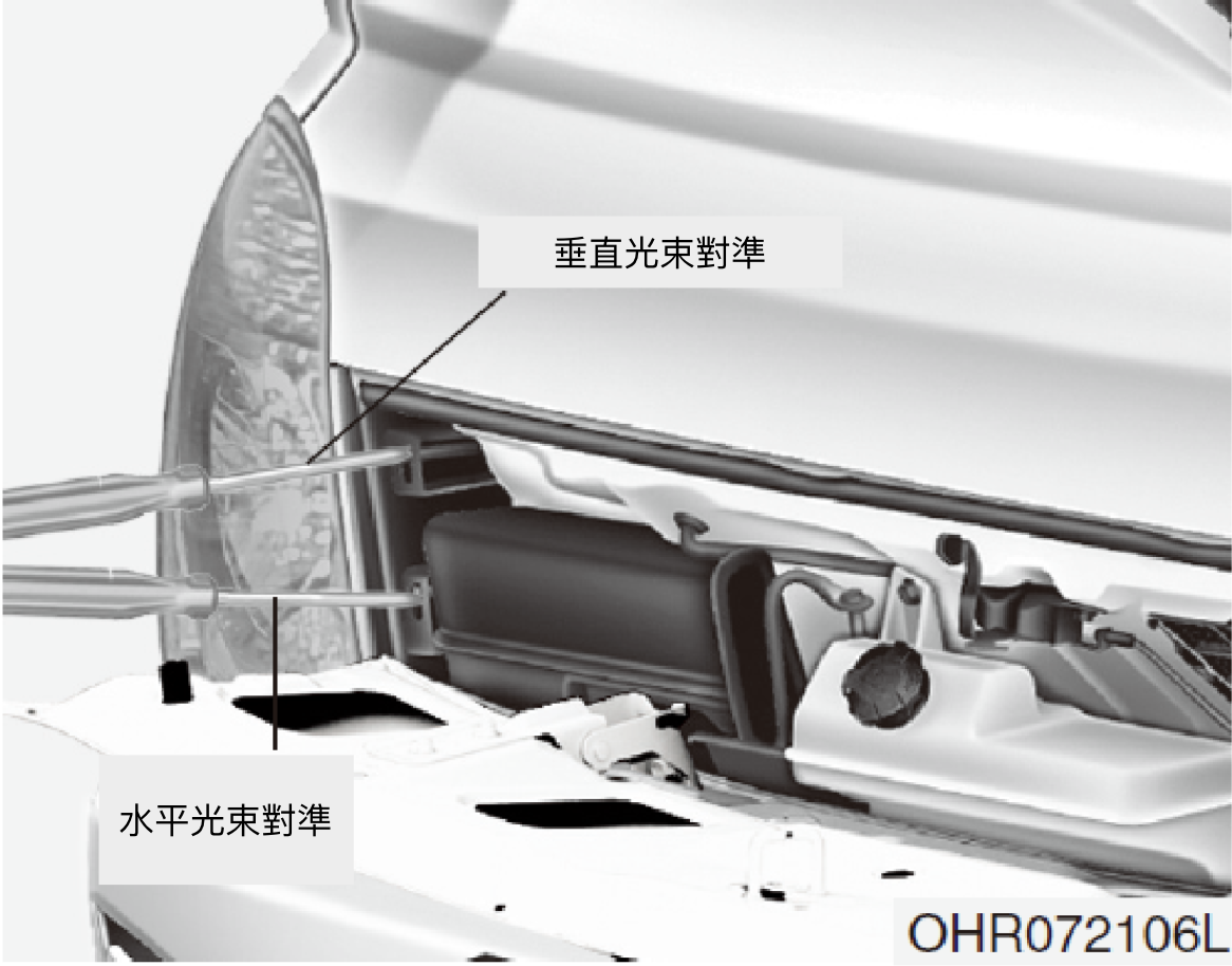 - 使用十字螺絲起子,將近光燈的明暗分界線調整到對正水平平行線 - 垂直光束對準。