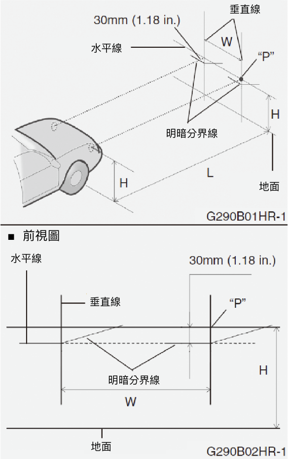 - 調整頭燈,使燈光主軸和車身中心線平行,並和圖中所示的 “P” 點對正。