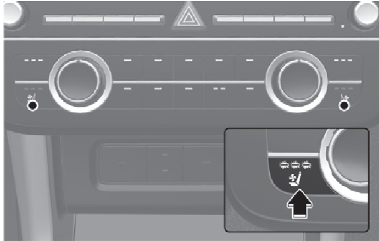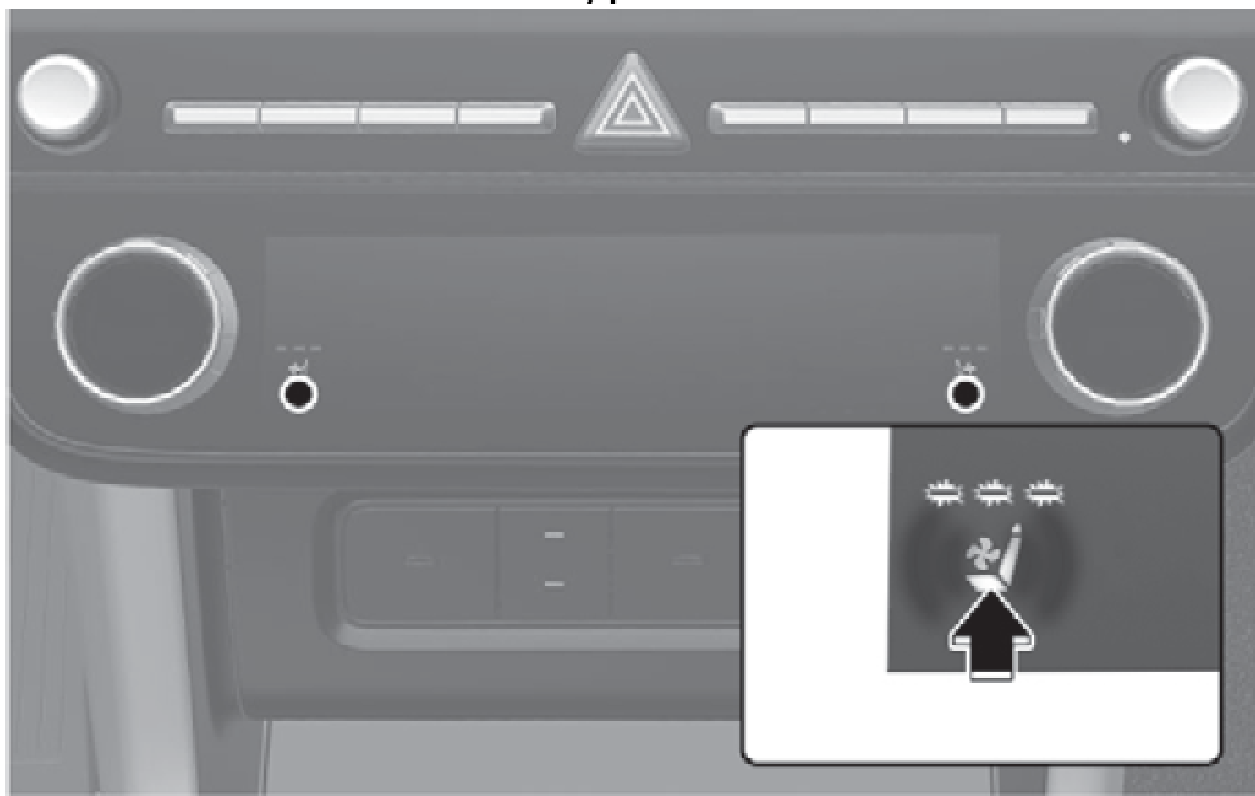 - 引擎運轉時,通風座椅會依據環境溫度和設定的空調溫度自動控制座椅溫度。如果通風座椅開關按下,通風座椅必須手動控制。欲使用此功能時,必須從資訊娛樂系統螢幕的 “設定” 選單啟用。