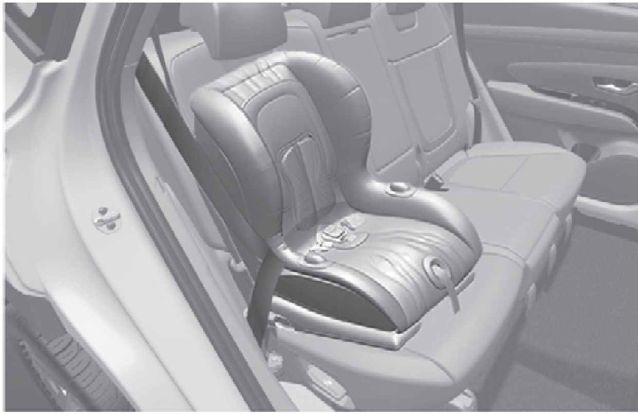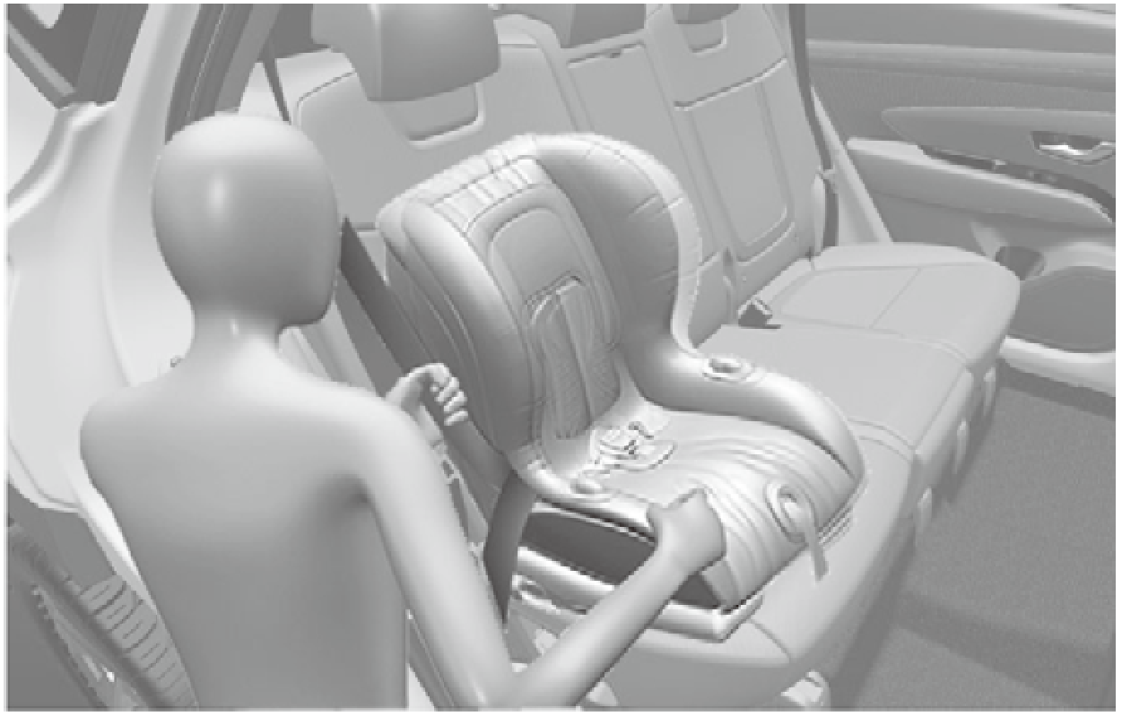 - 為了避免兒童接觸並被未縮回的安全帶纏住,必須扣住所有未使用的後座安全帶,並將未縮回的安全帶放在兒童背後。如果肩部安全帶纏繞兒童的頸部且安全帶收緊時,兒童可能會被勒住。