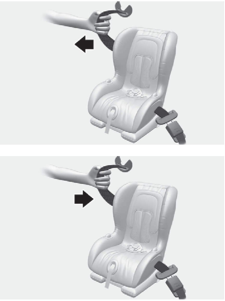 - 確認兒童防護系統確實固定。兒童防護系統安裝到車輛後,往前及往二側推拉座椅,以確認是否確實固定在座椅。使用安全帶固定的兒童防護系統必須盡可能牢固安裝。然而,一些側向位移不可避免。