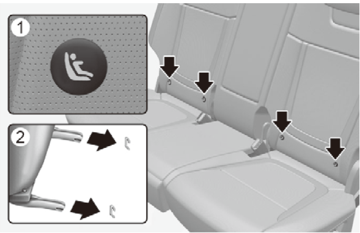 ISOFIX 固定器位於左後和右後外側座椅的椅背和座墊之間,並有符號指示。