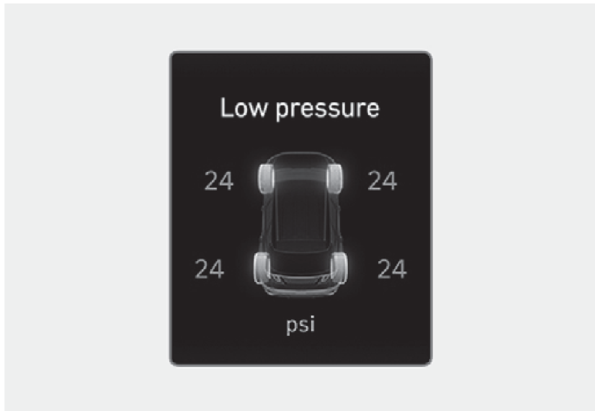 如果胎壓過低,此警告訊息將會顯示。車上對應的輪胎將會亮起。
