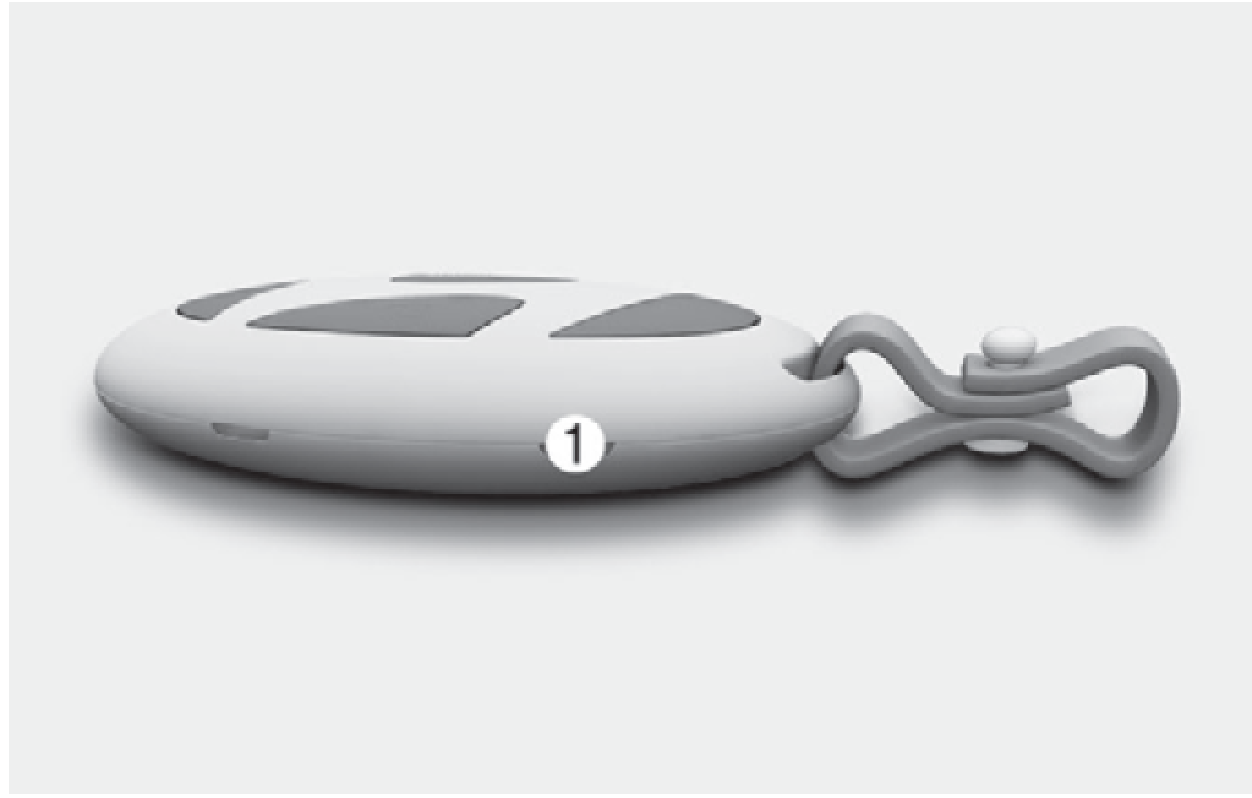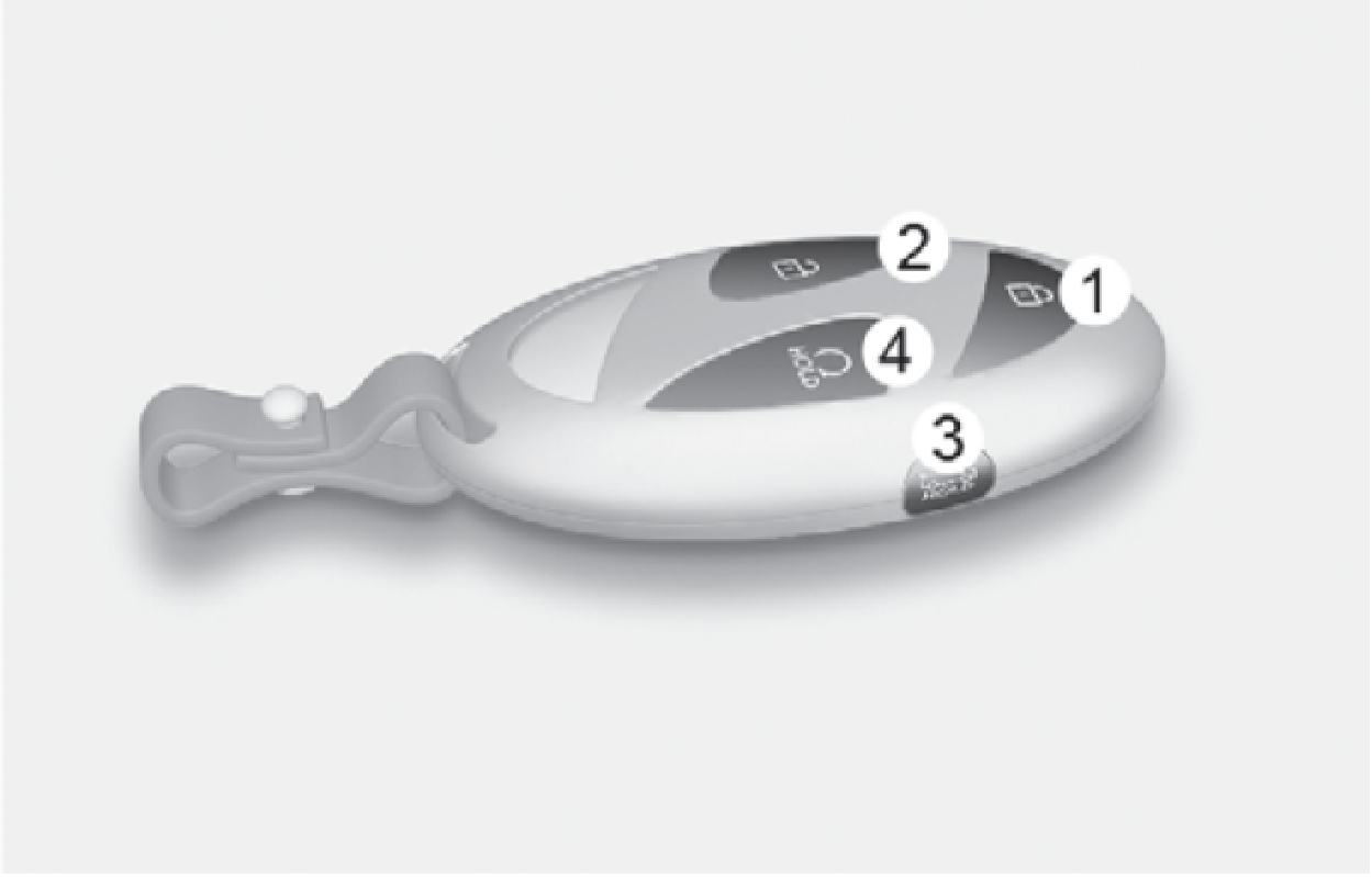 - 按下車門上鎖按鈕後2秒鐘內,按下智慧型鑰匙上的遙控啟動按鈕(4)。引擎將會啟動。