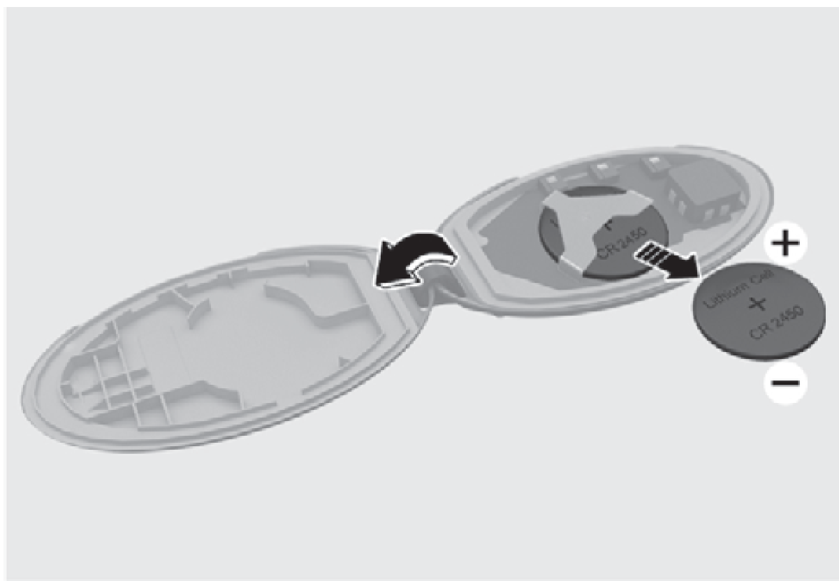 取出舊電池,並插入新電池。確認電池位置是否正確。電池安裝不正確可能會使電池消耗電力,造成智慧型鑰匙失效。